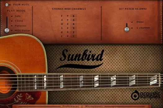The Sunbird library comes with 3 microphones perspectives, a stereo pair of DPA and you can adjust the volume of each of them. Every aspect of the library can be tweaked, the release, fret and pre-notes volumes, as well as the midi response of your keyboard.