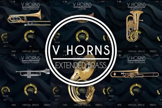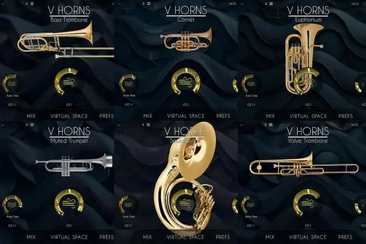 The VHorns Brass Section contains 6 instruments: Cornet, Muted Trumpet, Euphonium, Valve Trombone, Bass Trombone and Sousaphone.