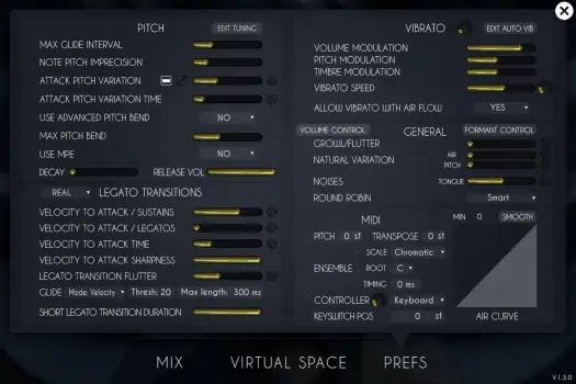 Our general controls allow for different playing techniques such as flutter, control over the harmonic series and volume of every note, as well as extraneous noises, natural variation and round robins.