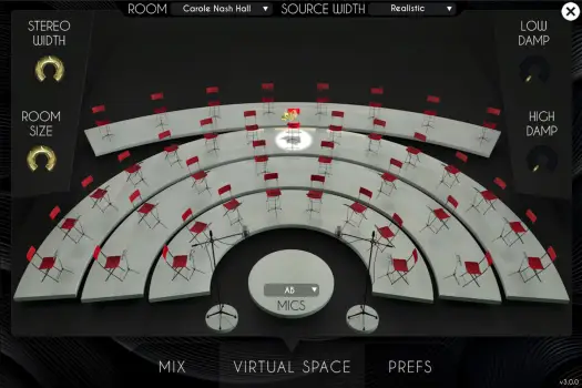 When the virtual mics are used (in the Mix tab), selecting a seat in the Virtual Space will place the instrument at that exact spot in the hall, dealing with the basics of depth, delay and panning all in one single click.
