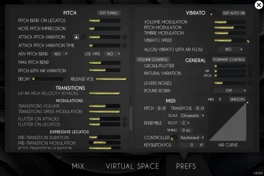 MIDI controls offer the possibility to finetune live ensemble playing, as well as the usual tranposition, pitch control, MIDI controller selection and a grid to tweak the shape of the airflow curve.
