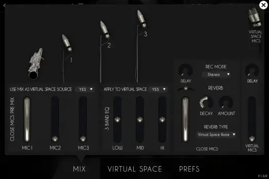 Various microphone positions can produce even better results when using the "virtual space”, detailed below, where there are 2 rooms, each with 4 options for microphone configurations.