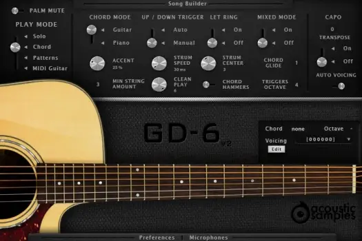The GD-6 acoustic guitar can strum, in various ways, up, down, muted, in legato and allows picking. Everything is modeled after meticulously analyzing thousands of real chords played by guitarist. Every aspect of the strumming engine can be tweaked to achieve the sound you want.