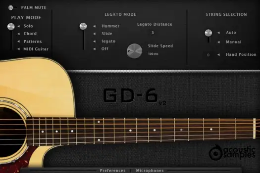 The GD-6 acoustic guitar features our powerful legato engine that will automatically trigger legato, hammer ons, pull offs, or slides and the legato distance will define the maximum interval in which the legato will apply.