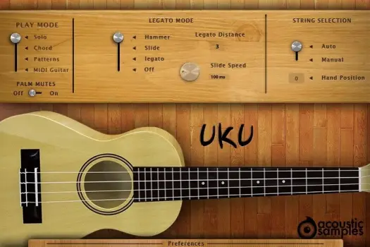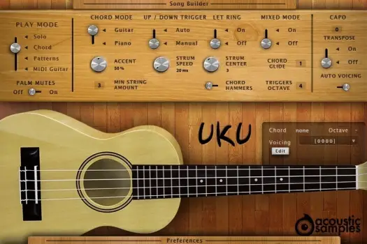 The UKU can strum, in various ways, up, down, muted, in legato and allows finger strumming or finger picking. Everything is modeled after meticulously analyzing thousands of real chords played by ukulele player. Every aspect of the strumming engine can be tweaked to achieve the sound you want.